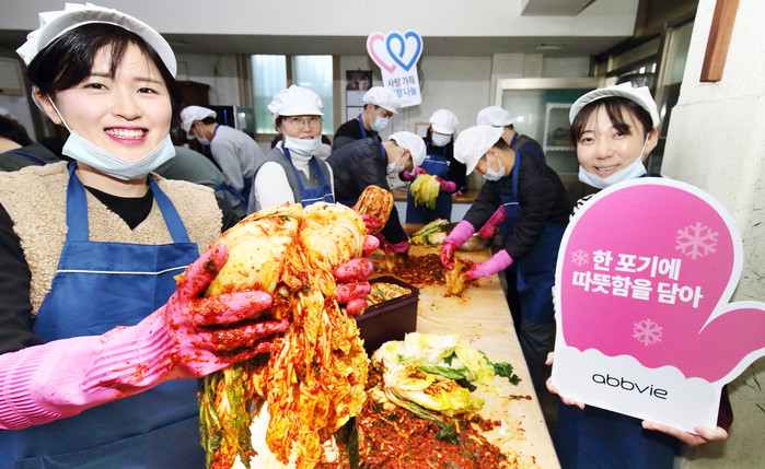 한국애브비는 매년 6월 가능성 주간(Week of Possibilities)과 12월을 전직원이 봉사하는 날로 지정해 지역 사회의 건강 관련 소외 이웃들을 위한 봉사활동을 꾸준히 펼쳐왔다. 특히, 요셉의원 사랑의 김장 담그기는 2013년 창립 이래로 현재까지 진행하고 있는 봉사활동 프로그램이다. 올해 김장 봉사에 참여한 직원들은 추운 날씨에도 불구하고 지난 7년간 다져진 김장 봉사 경험을 발휘해 소외 이웃들을 위한 월동 준비용 김치 총 300포기를 전달했다.