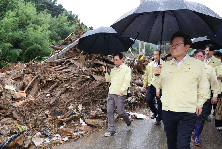 [세계타임즈=이채봉 기자] 이재명 대통령은 21일 경남 산청군을 방문해 최근 이어진 집중호우 피해 현장을 점검하고 복구 계획에 대한 보고를 받았다.이 대통령은 노란색 민방위 옷을 입고 장화를 신은 채 우산을 들고서 마을 내 토사가 흘러내린 곳이나 시설물이 파괴된 곳을 돌아봤다.산청군에 마련된 호우피해 통합지원본부에 들러 윤호중 행정안전부 장관, 박완수 경남도지사 등과 향후 대책을 논의했다.