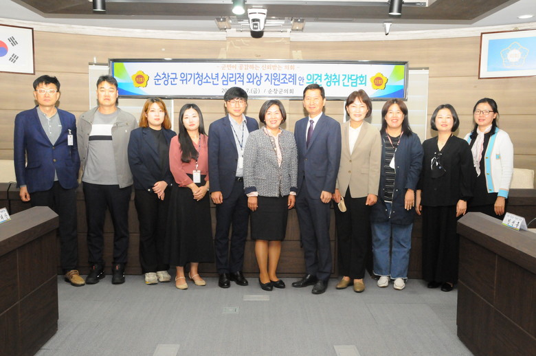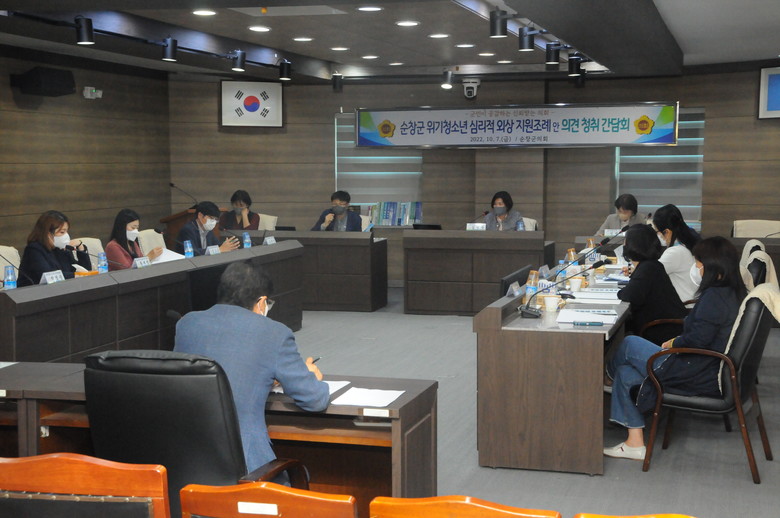 [순창=세계타임즈 = 이영임 기자] 순창군의회(의장 신정이)가 지난 7일 순창군의회 위원회실에서 순창군 위기청소년 심리적 외상 지원 조례안에 대한 의견청취 간담회를 가졌다. 이날 간담회에는 순창군 아동 및 정신건강 담당 부서 관계자와 순창경찰서 여성청소년계장, 청소년 관련 기관 대표 등 8명이 참석해 다양한 의견을 나눴다.