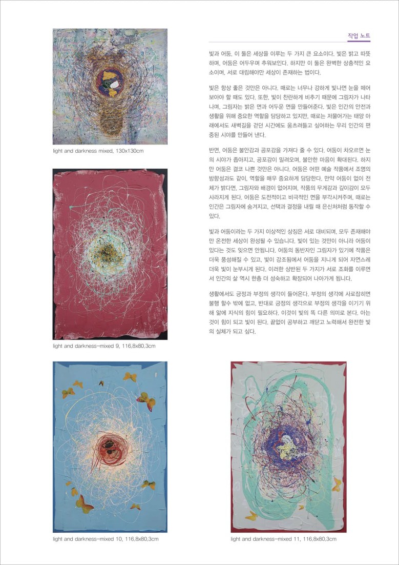 생활에서도 긍정과 부정의 생각이 들어온다. 부정의 생각에 사로잡히면 불행 할 수 밖에 없고, 반대로 긍정의 생각으로 부정의 생각을 이기기 위해 앎에 지식의 힘이 필요하다. 이것이 빛의 똑 다른 의미로 본다. 아는 것이 힘이 되고 빛이 된다. 끝없이 공부하고 깨닫고 노력해서 완전한 빛의 실체가 되고 싶다.“ 며 전시회에 대한 생각과 목적을 밝혔다.