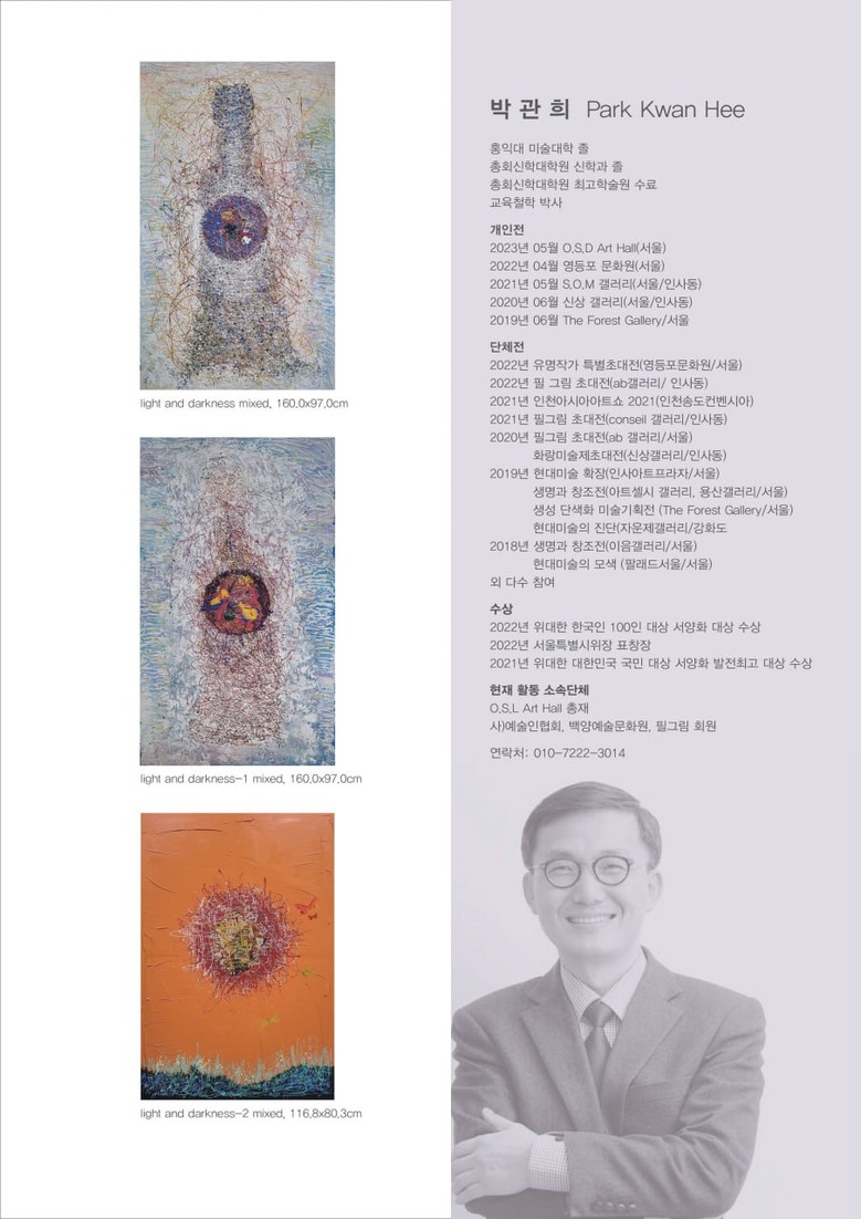 [세계타임즈 백진욱 기자] 박관희 서양화가 빛과 어둠(light and darkness)이란 제목으로 5월 29(월)부터 6월10일(토)까지 영등포구 국회대로 640 준빌딩 3층에 위치한 O.S.D. ART Hall에서 개인 전시회를 개최한다.