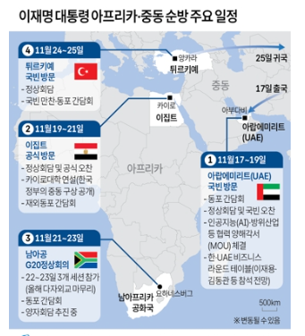 이후 이집트로 이동해 20일 압델 파타 엘시시 대통령과의 정상회담, 카이로대학 연설 등의 일정을 진행한다.남아공에서는 G20 정상회의 3개 세션에 참석해 포용적이고 지속 가능한 성장, 기후변화와 재난, 공정한 미래 등에 관해 논의한다.한국이 주도하는 중견 5개국 협의체인 '믹타'(MIKTA) 소속국 정상들과의 회동도 예정돼 있다.이 대통령은 마지막으로 튀르키예의 수도 앙카라를 방문, 레제프 타이이프 에르도안 대통령과의 정상회담 및 MOU 서명식 등을 소화한 뒤 26일 귀국한다.