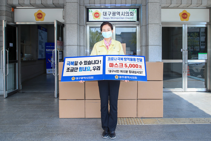 광주광역시의회(의장 김동찬)에서는 ‘코로나19’에 맞서 힘겨운 싸움을 이어가고 있는 대구를 응원하기 위해, 광주광역시 의원들이 자발적으로 성금을 모아 구입한 마스크 5천장(600만원 상당)을 대구광역시의회에 전달하며 하루빨리 상황의 진정을 기원했다.