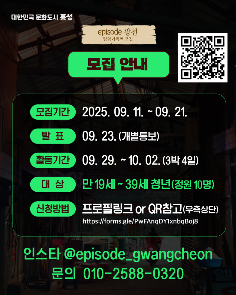 참여 신청은 오는 21일까지 가능하며, 최종 선정자는 9월 23일 발표된다. 자세한 내용은 홍주문화관광재단 홈페이지와 인스타그램(@episode_gwangcheon)에서 확인 및 신청할 수 있으며, 관련 문의는 041-545-0128로 하면 된다.