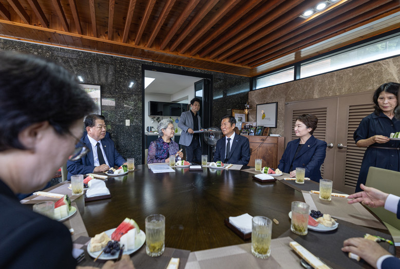 정 대표는 문 전 대통령에게 "지금까지 뵌 것 중에 가장 목소리가 크시다. 편하신 것 같다"고 말을 건넸다.정 대표는 "국가보훈정책특위를 만들어 애국자를 기리는 보훈 사업을 잘하겠다"며 "민주주의와 평화는 경제 발전의 토대"라고 말했다. "문재인 정부에선 대통령이 평양에 다녀오는 등 남북교류 협력을 했었는데, 지난 3년간 그 토양이 많이 무너진 것 같아 아쉽다"며 "그런 부분을 잘 복원해야 한다"고 덧붙였다.