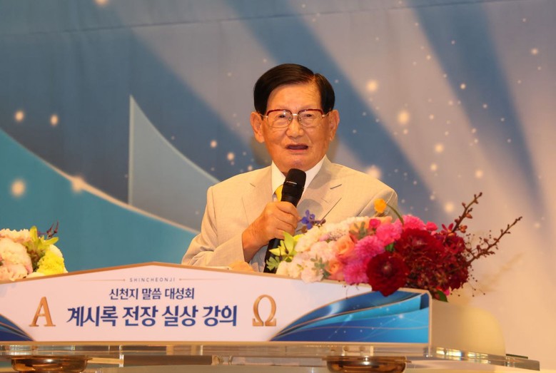 (10월 7일 서울 종로구 HW컨벤션센터에서 열린 '신천지 말씀대성회'에서 신천지 예수교 증거장막성전 이만희 총회장이 설교하고 있다)