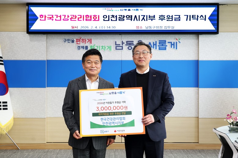 [남동구 세계타임즈=심하린 기자] 인천시 남동구는 한국건강관리협회 인천광역시지부(본부장 이상철)로부터 어려운 이웃을 위한 후원금 300만 원을 기탁받았다고 6일 전했다.
