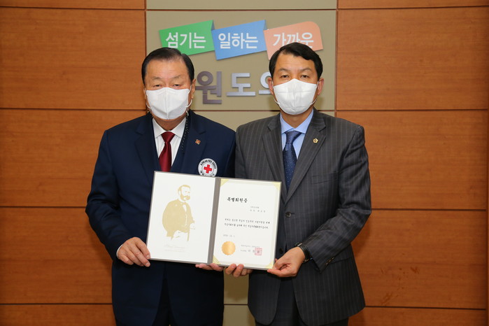 [강원도=세계타임즈 김민석 기자] 강원도의회(의장 곽도영)은 12월 1일(화) 14시 30분 도의회 상담실에서 2021년 대한적십자사 특별회비 전달식을 개최하였다.