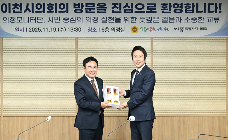 [세종 세계타임즈=이채봉 기자] 세종특별자치시의회(의장 임채성)는 19일 벤치마킹을 위해 세종시의회를 찾은 이천시의회 방문단을 맞이했다.