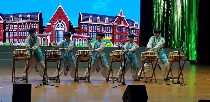 저녁식사 후 애화외국어학교 대강당에서는 한중 문화교류가 펼쳐졌다. 중국 측에서는 춤과 노래로 진행되는 공연에 이어 농구공을 활용한 단체 공연, 무술로 이뤄진 춤 등을 선보였고, 한국 문화로는 무악중학교와 무악여고의 ‘멀시’팀과 ‘크러시’팀의 각각의 댄스공연과 북 공연, 사물놀이 등이 펼쳐져 우뢰와 같은 박수갈채를 받았다. 이날 행사에는 옌타이에 소재한 한국학교 공연팀도 참석해 눈길을 끌었다. 양국 청소년들이 마음의 문을 활짝 여는 순간이었다. 특히 애화외국어학교 고등학교 3년생으로 베이징대에 입학을 앞둔 한국인 학생 정시훈양과 이다윤양이 통역하면서 중국인 학생과 함께 사회를 맡아 이채를 띠었다.