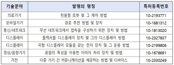 선별된 주요기술에는 착용자의 두피로부터 신호를 측정해 현재 보행 속도를 계산하고 목표로 하는 보행 속도가 되도록 보조 토크를 연산해 출력하는 '착용형 로봇', 사용자의 화면 구부림 동작만으로 플렉서블 디스플레이 화면의 물체가 이동해 어플 기능을 실행하는 '디스플레이 장치' 특허 등이 있다.