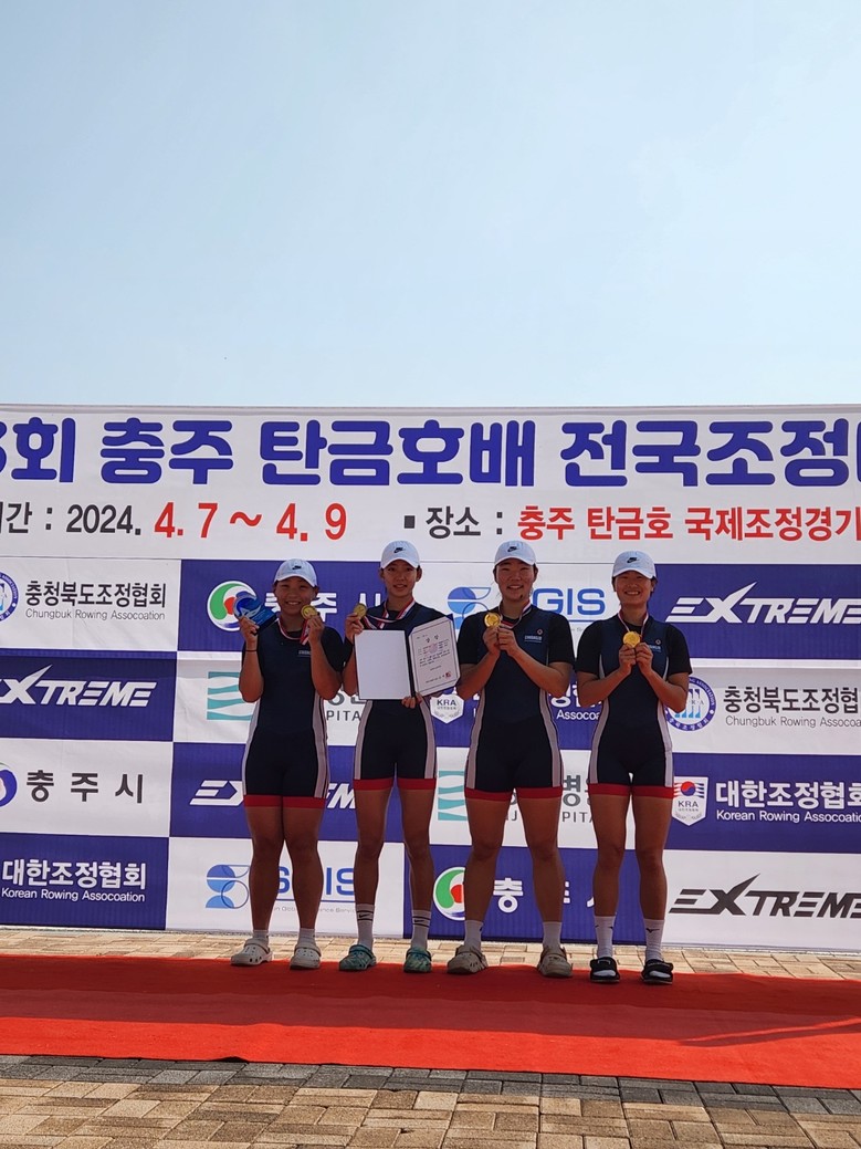 서예서,김정민,김승현(이상 2년), 김지선(1년) 선수(6분58초17)는 충주여고(7분27초27)에 큰 기록 차이를 두며 여유롭게 여고부 쿼드러플스컬 금메달을 획득했다.