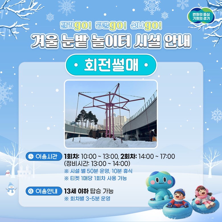 경기도는 겨울방학을 맞은 아이들과 가족이 도심 속에서 안전하게 겨울 놀이를 즐길 수 있도록 ‘겨울 눈밭 놀이터’를 운영하게 됐다고 취지를 설명했다.