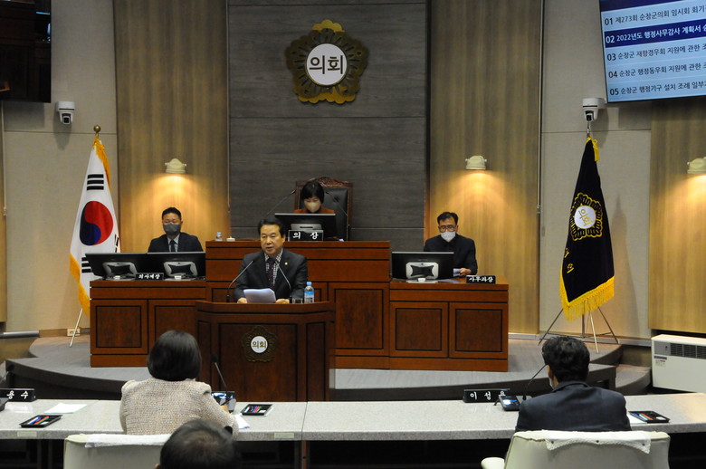 [순창=세계타임즈 = 이영임 기자] 창군의회(의장 신정이)가 10월 25일 제273회 임시회를 개회했다. 이번 임시회는 제1차 본회의를 열고 2022년도 행정사무감사 계획서를 승인, 순창군 행정기구 설치 조례 일부개정조례안과 의원발의 조례 4건을 의결했다.