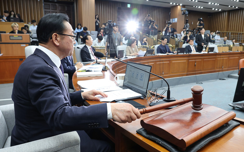 18일 국회에서 열린 국무총리 임명 동의에 관한 인사청문특별위원회 회의에서 국민의힘 소속 이종배 위원장이 의사봉을 두드리고 있다. 2025.6.18
