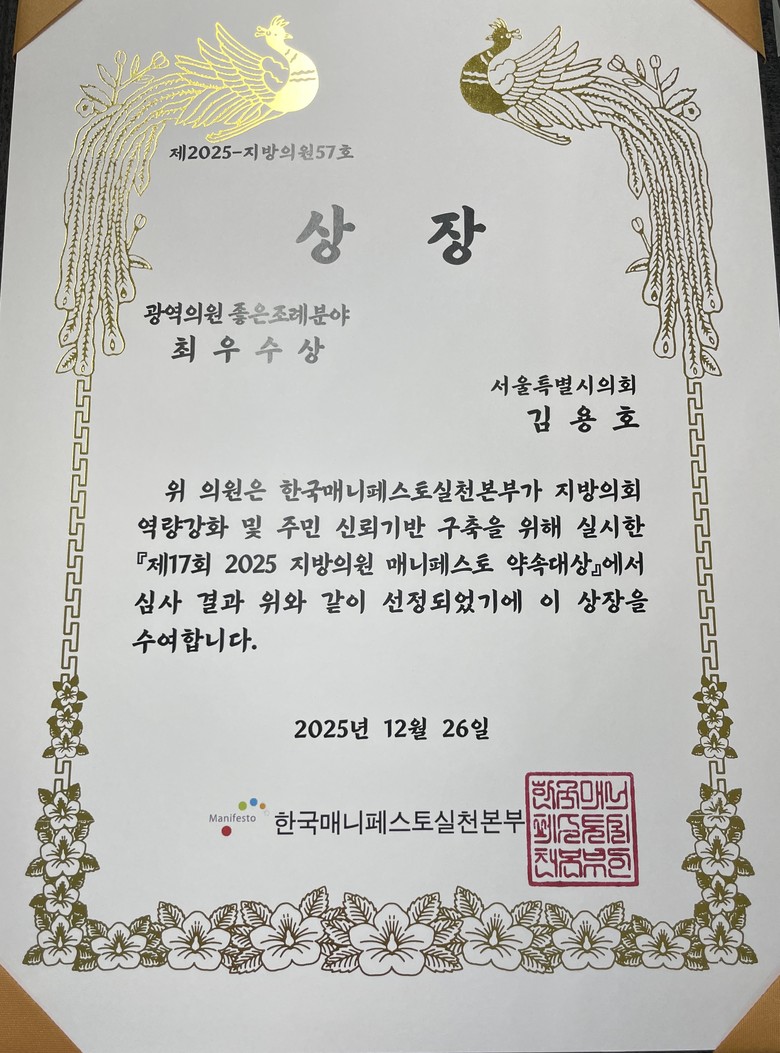 [서울 세계타임즈=이장성 기자] 서울특별시의회 도시안전건설위원회 부위원장으로 활동하고 있는 김용호 시의원(국민의힘, 용산1)은 지난 1월 6일 ‘제17회 2025 지방의원 매니페스토 약속대상’ 광역의원 조례분야에서 최우수상 수상자로 지난해 12월 26일 선정됐다고 밝혔다.