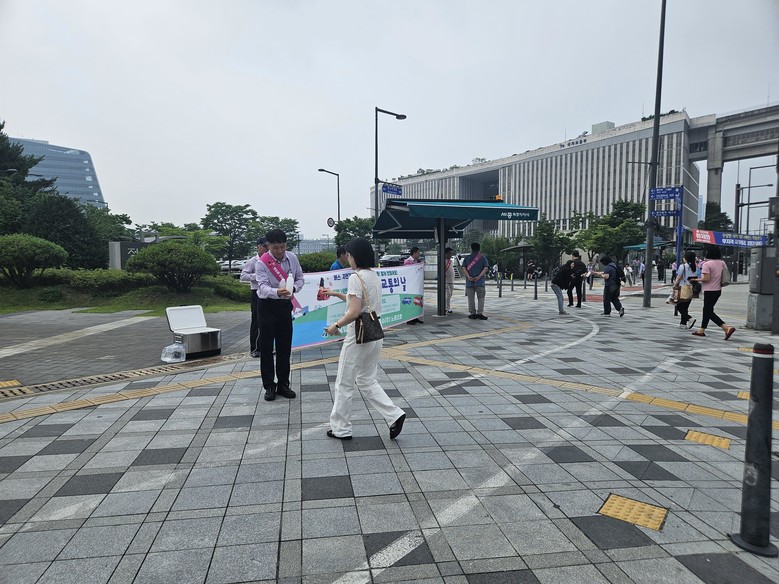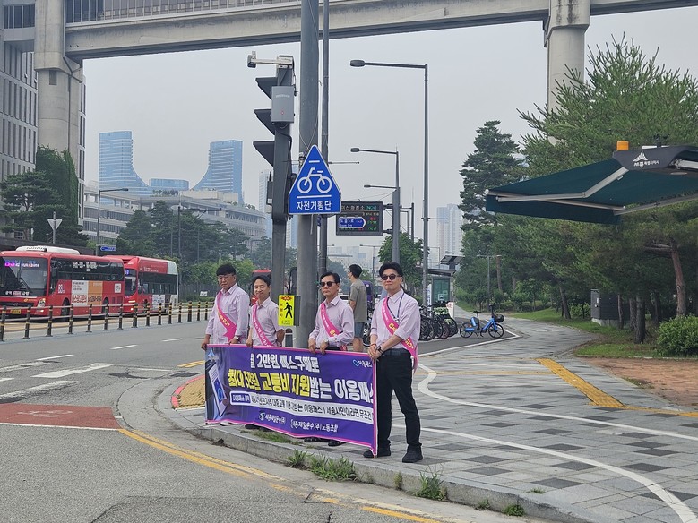 이날 세종제일운수 임직원과 승무사원 30여 명은 정부세종청사 북측 승강장 일원에서 폭염대비 얼음생수를 제공하며, 세종사랑‘대중교통의 날’ 홍보 캠페인을 전개하였다.