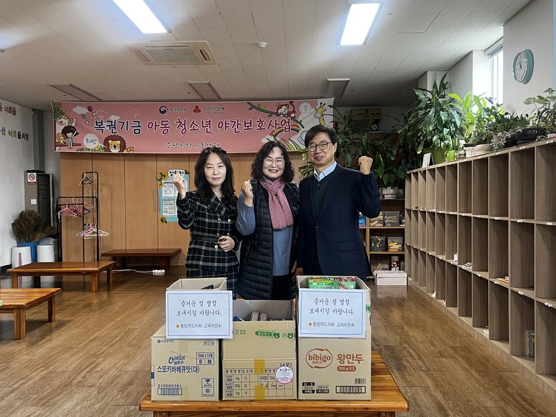 교육위원회 박봉순 의원(청주10)은 13일 가경지역아동센터를, 김성대 의원(청주8)은 현양노인복지센터를 각각 방문했으며 14일에는 박병천 의원(증평)이 증평지역아동센터를 방문해 시설에 필요한 물품을 전달했다.