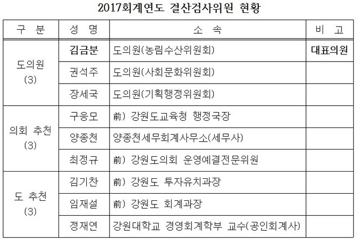 [강원도=세계타임즈 김민석 기자] 강원도의회(의장 직무대리 권혁열 부의장)는 4월 30일 도의회 상담실에서 9명의 결산검사위원(대표위원: 김금분)을 위촉하고, 강원도 및 도교육청 소관 2017회계연도 결산검사를 시작한다.