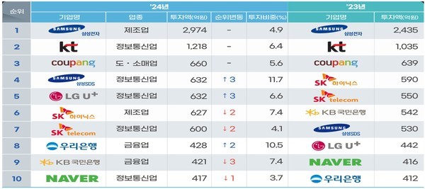 정보보호 투자 규모는 삼성전자, KT, 쿠팡 순으로 높았으며, 상위 10대 기업 중 절반이 정보통신업으로 나타났다.