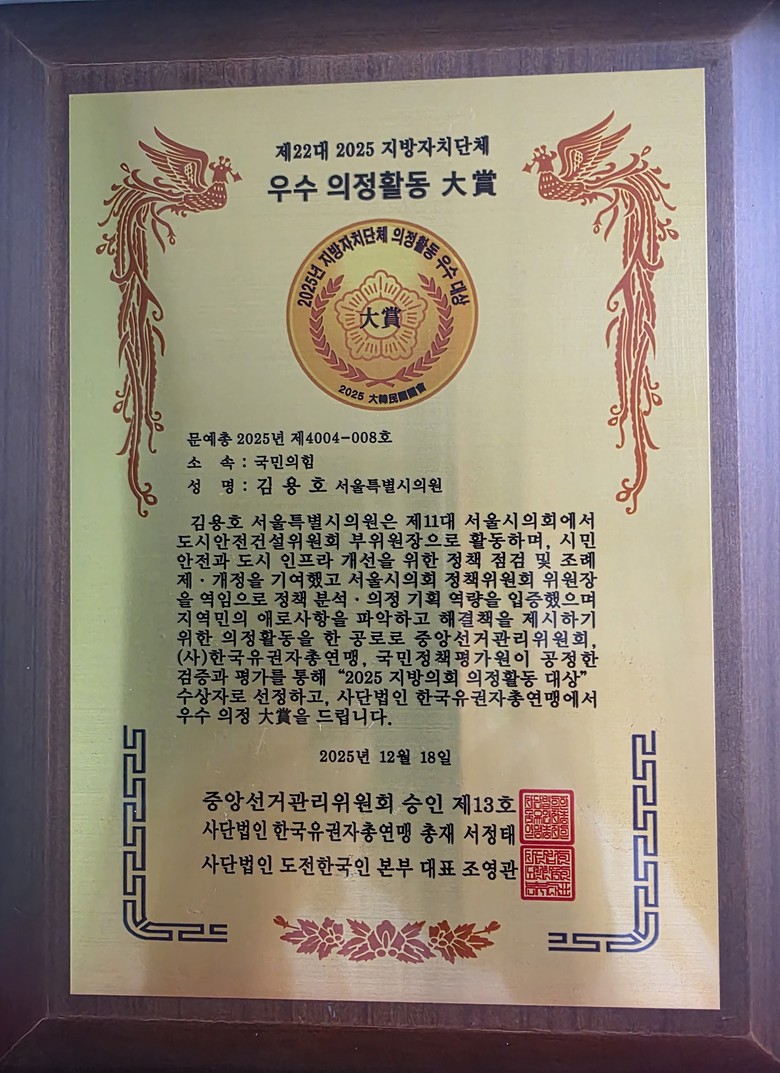 [서울 세계타임즈=이장성 기자] 서울특별시의회 도시안전건설위원회 부위원장으로 활동하고 있는 김용호 시의원(국민의힘, 용산1)은 지난 12월 18일 국회도서관 소강당에서 열린 ‘2025 제18회 국정감사평가 시상식 및 제3회 국제도전상 시상식’에서 ‘2025 광역·기초자치단체 의정활동 대상’을 수상했다.