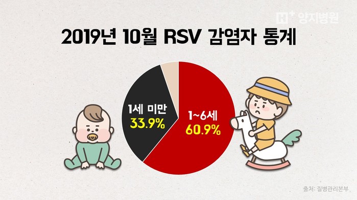 에이치플러스 양지병원 소아청소년과 양무열 과장은 “RSV 는 1~6세 영유아에게 주로 발생하며 기침, 콧물, 재채기, 발열 등 감기와 유사한 증상으로 시작하여 심해지면 쌕쌕거림과 코막힘, 구토를 동반한다”고 말했다. 특히 영유아의 RSV 감염증은 호흡곤란, 폐렴, 모세기관지염 등으로 이어질 수 있어 각별한 주의 필요하다. 질병관리본부의 2019년 10월 RSV 감염자 통계에 따르면 1~6세 환자는 60.9%, 1세미만은 33.9% 로 나타났다. 전체 신고건수의 95% 가까이 6세 이하 영유아이다.
