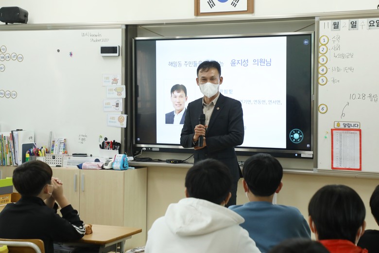 특히 윤지성 의원은 학생들의 질문에 “의원은 지역의 여러 과제들을 해결하기 위해 필요한 조례를 만들고 지역의 1년 살림살이인 예산안을 검토하고 확정한다”며 “그 외에도 지역의 다양한 문제를 해결하기 위해 관련 단체‧기관과 논의하고 합리적인 해결 방안을 만들기 위해 노력한다”고 답했다.