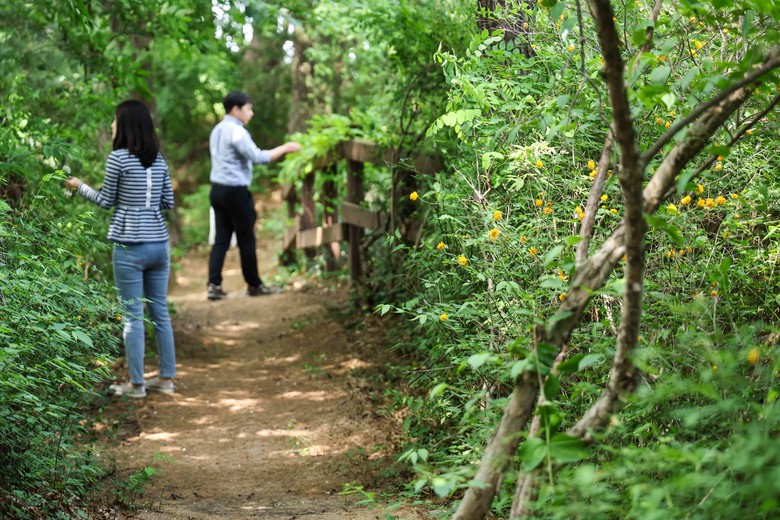 곳곳에 설치된 벤치에 잠시 앉아 사색과 명상을 즐기는 것도 방법이다. 산책로 초입의 대나무 숲은 대나무가 하늘로 쭉쭉 뻗어 있어 시원한 느낌을 주고, 길을 따라 쭉 걷다 보면 우거진 수풀 사이로 솔솔 불어오는 아카시아 꽃향기가 향긋하다. 목마길 끝자락에는 빨간 장미덩굴 아치가 방문객들의 눈길을 사로잡는다. 약 10분간의 산책코스를 돌고 밖으로 나오면 분수광장이 기다리고 있는데, 산책로를 걸으며 송골송골 맺힌 땀방울을 이곳에서 시원하게 날릴 수 있다.