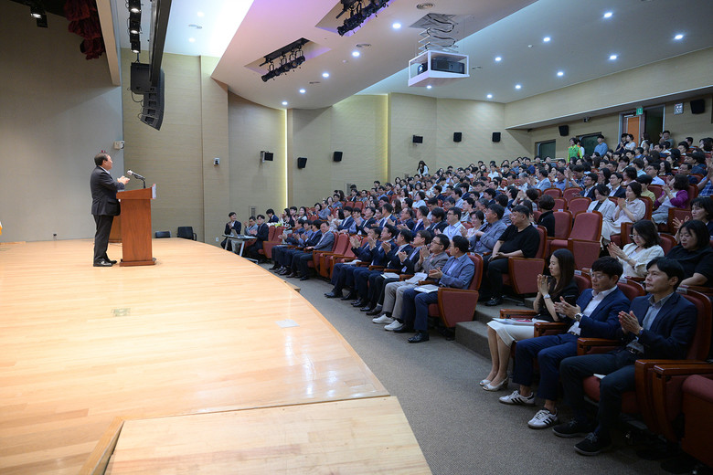 최민호 시장은 2일 시청 여민실에서 직원 300여 명이 참석한 가운데 열린 6월 직원 소통의 날 행사에서 공화국이 시작된 역사를 통해 투표의 가치를 설명하고 직원들에게 투표 참여를 독려했다.