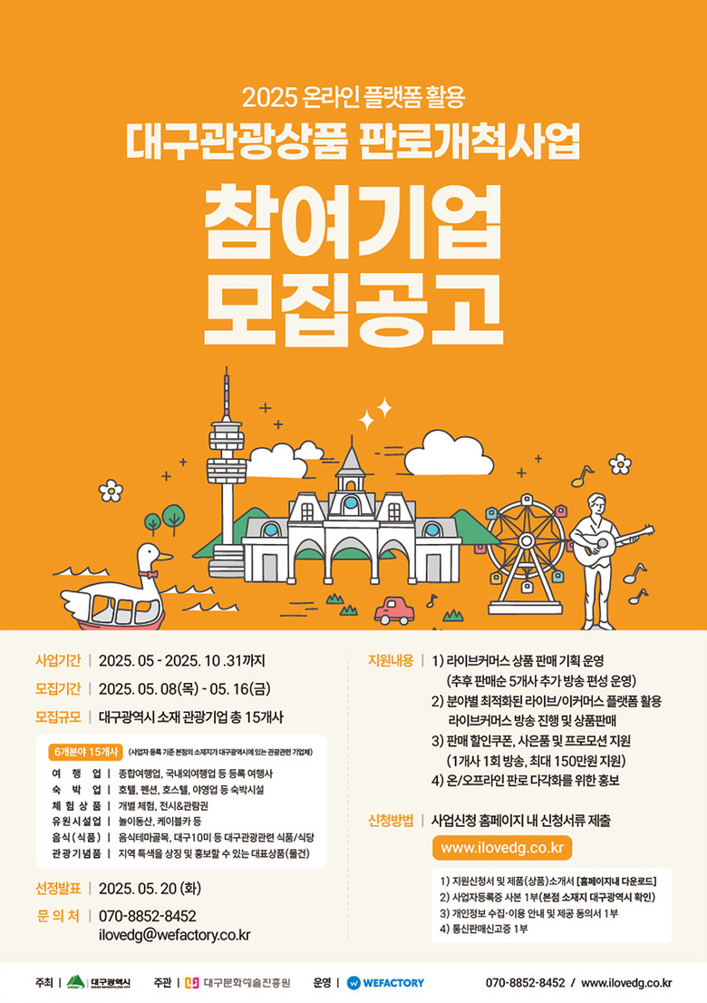 모집 대상은 사업장(본점) 소재지가 대구시에 있는 관광 관련 사업체로 공고일 기준 통신판매업 등록증이 있거나 5월 16일(금)까지 통신판매업 등록을 완료할 수 있는 사업체를 대상으로 진행한다.