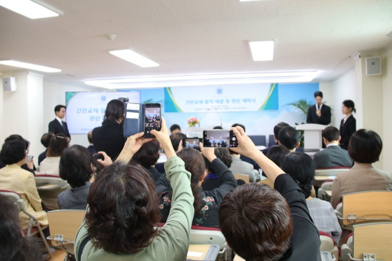 이번 간판 교체 협약식은 전민중 담임강사, 김 목사를 비롯해 50여 명이 참석한 가운데 진행됐다. 본 행사는 김 목사의 기념사, 전 담임 강사의 답사, 협약서 서명, 제막식 순으로 이어졌다.
