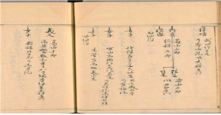 | ▲< 일본 선철상전(先哲像傳) 1권 출처: 일본국립 국회도서관 > 다케다 노부토라(武田信虎)와 노부토라의 아들 노무토모(信友) 그리고 그의 딸들에 관한 계보가 기록되어 있다 |