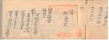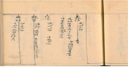 | ▲< 다케다 하루노부(武田晴信)에 관한 계보, 옆에 신겐(信玄)이라고 기록되어 있음 > |