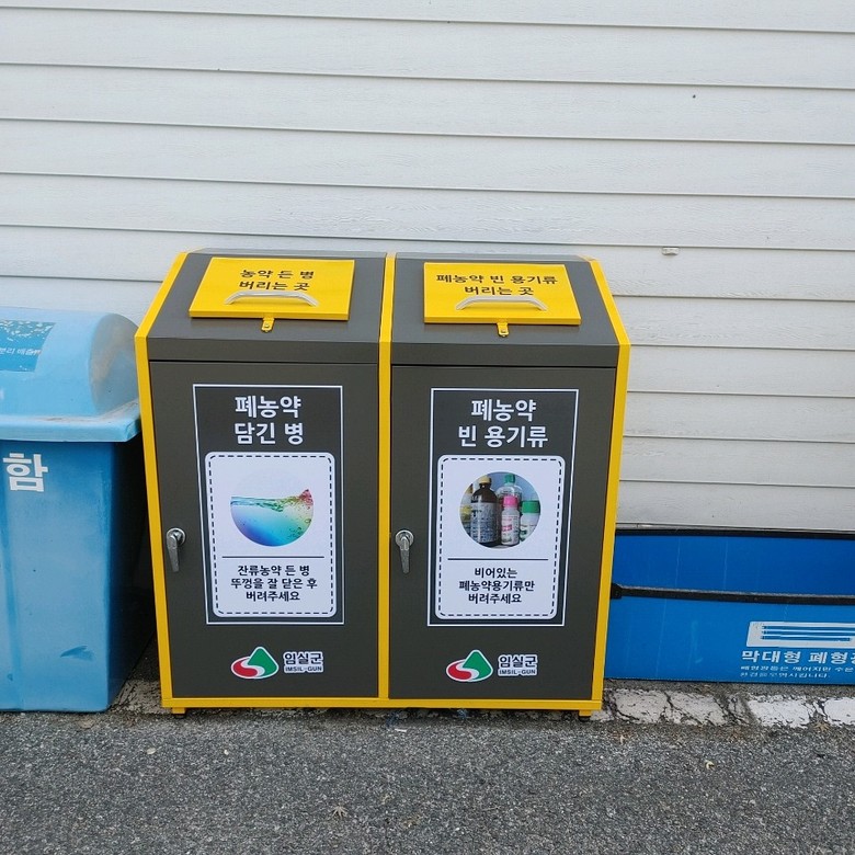 이번에 읍‧면사무소에 배치된 폐농약 수거함은 두 개의 함으로 구성되어 있으며, 폐농약이 남아 있는 농약병째 버리는 수거함과 빈 농약 용기 수거함으로 구분하여 배출하면 된다.