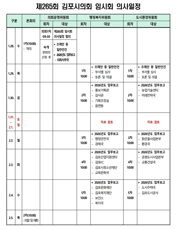 주요 일정을 살펴보면, 1월 29일에는 의원발의 3건과 집행기관이 제출한 7건의 조례안, 기타안 1건에 대한 심의가 예정돼 있으며, 이후 1월 30일부터 2월 4일까지는 김포시 각 부서 및 산하기관으로부터 2026년도 시정업무보고가 이어진다.