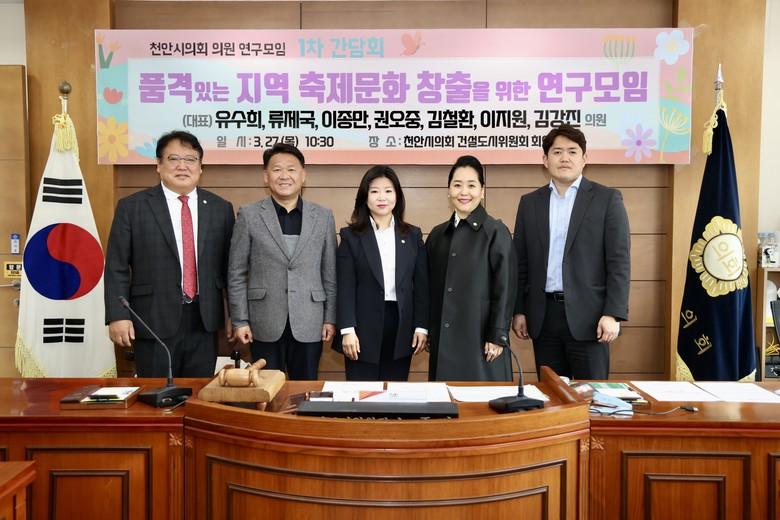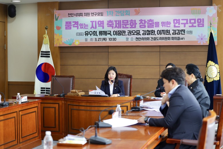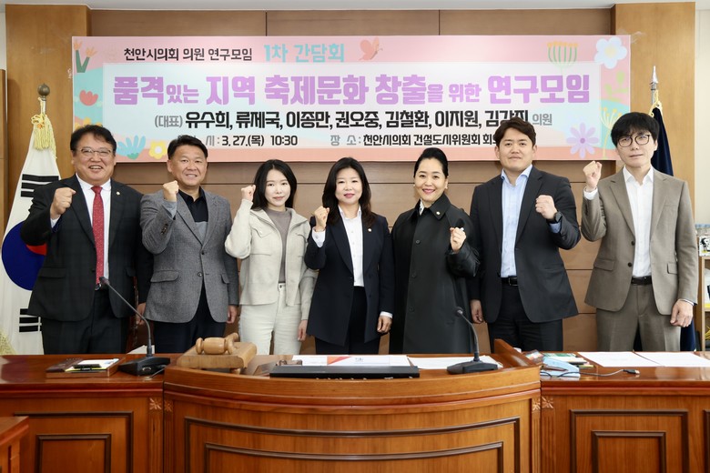 [천안시 세계타임즈=이현진 기자] 천안시의회(의장 김행금)는 「품격있는 지역 축제문화 창출을 위한 연구모임」 유수희(대표의원), 류제국, 이종만, 권오중, 김철환, 이지원, 김강진 의원은 27일 건설도시위원회 회의실에서 1차 간담회를 개최하고 연구모임의 첫걸음을 내디뎠다고 밝혔다.