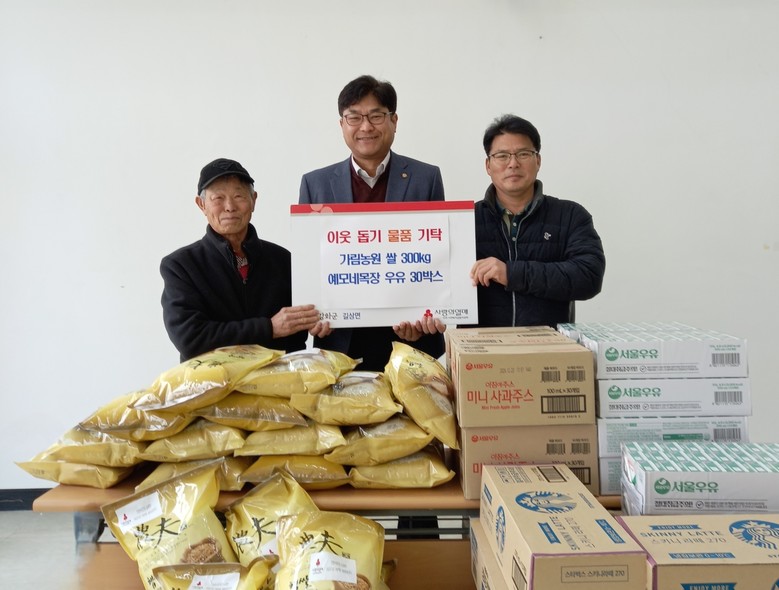 [강화군 세계타임즈=심하린 기자] 강화군 길상면(면장 서광석)은 지난 5일, 다가오는 설 명절을 맞아 가림팜 영농조합에서 쌀 300kg과 예모네 목장에서 우유 등 음료 30박스를 관내 어려운 이웃을 위해 기부했다고 전했다.