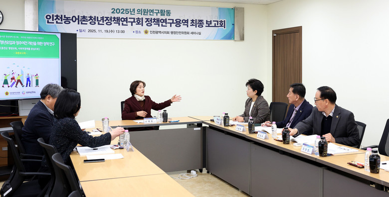 [인천 세계타임즈=심하린 기자] 인천광역시의회 의원연구단체 ‘인천 농어촌 청년정책 연구회(대표의원 신영희)’가 19일 행정안전위원회 세미나실에서 정책연구용역 최종보고회를 열고, 농어촌·도서 지역의 인구 감소 대응을 위한 평생교육·사회적경제 기반 청년 정착 모델을 발표했다.