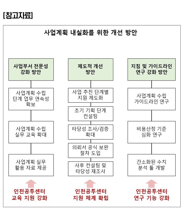 또한, 인천시 사업계획 내실화를 위한 개선방안과 인천공공투자관리센터의 단계별 지원 확대 방안으로, △사업부서의 전문성 강화, △제도적 개선, △지침 및 가이드라인 연구 강화 등을 제시하였다.