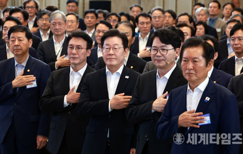 오른쪽부터 더불어민주당 정청래 대표, 이한주 국정기획위원장, 이 대통령, 김민석 국무총리, 구윤철 경제부총리 겸 기획재정부 장관. 2025.8.13