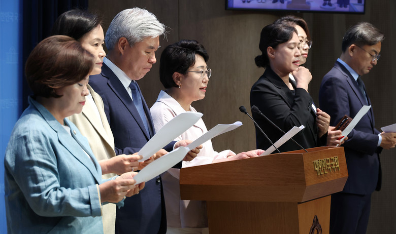 조국혁신당 김선민 당 대표 권한대행을 비롯한 의원들이 16일 서울 여의도 국회 소통관에서 심우정 검찰총장 사퇴 촉구 기자회견을 열고 있다. 2025.6.16
