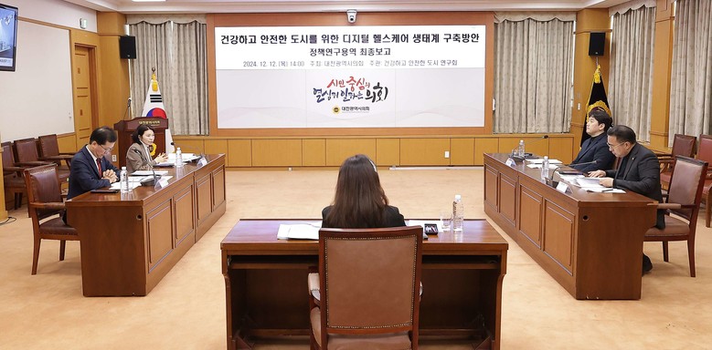 [대전 세계타임즈=이채봉 기자] 대전시의회 의원연구회인 ‘건강하고 안전한 도시 연구회’는 12일 오후 2시 시의회 소통실에서 ‘건강하고 안전한 도시를 위한 디지털 헬스케어 생태계 구축 방안 연구용역 최종 보고회’를 개최했다.