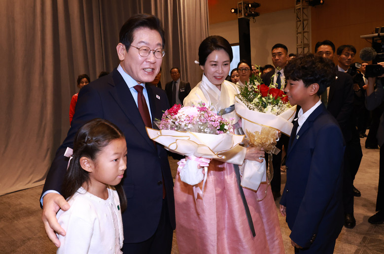 이재명 대통령과 김혜경 여사가 24일(현지시간) 미국 워싱턴DC의 한 호텔에서 열린 동포 만찬 간담회에 참석해 화동으로부터 꽃다발을 받고 있다. 2025.8.25
