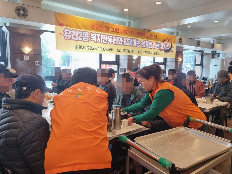 [중구 세계타임즈=이채봉 기자] 대전 중구 유천2동(동장 구순서)은 지난 7일 유천2동 복지만두레(회장 김순이)에서 겨울철 취약계층인 독거 어르신 60명에게 삼계탕을 대접했다고 밝혔다.