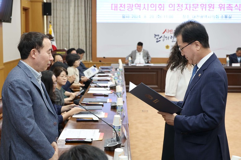 이날 위촉식을 주관한 조원휘 의장은 “대전시의원들의 의정활동 품격은 의정자문위원들에게 달려있는 만큼 대전발전과 시민생활의 발전을 위한 보다 실질적인 제안과 자문을 부탁한다”면서, “지금은 진정한 의정발전을 위해 민관(民官)협치를 넘어 의민(議民)협치가 필요한 시대로, 자문위원들의 제안이 입법과 정책 분야에 실현되면 제안자의 실명을 널리 알리는 입법정책실명제를 도입하겠다”는 계획을 밝혔다.