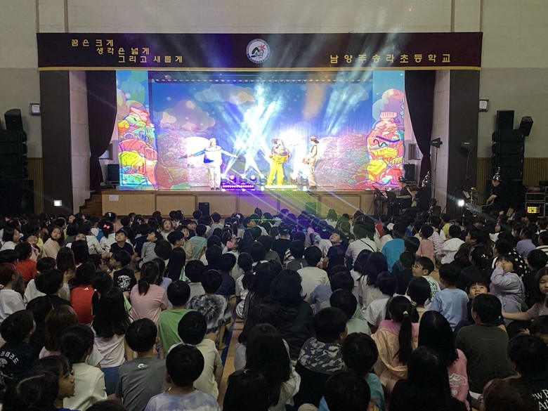 [남양주시 세계타임즈=송민수 기자] 남양주송라초등학교(교장 김영석)는 9월 18일(목) 오후 1시부터 약 50분 가량 환경뮤지컬 ‘꼬옥이와 함께하는 두근두근 새로나 챌린지’를 관람하였다.