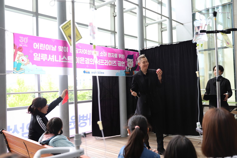 | ▲일루셔니스트 이은결이 분당차여성병원 소아병동에 깜짝 방문해 공연을 펼치고 있다.(사진=분당차병원) |
