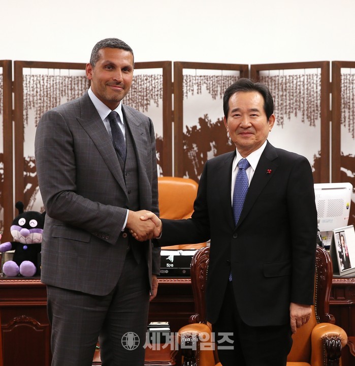 [세계타임즈 이채봉 기자]정세균 국회의장은 1월 8일(월) 오후 3시 국회의장 집무실에서 칼둔 칼리파 알 무바락(Khaldoon Khalifa Al Mubarak) UAE 아부다비 행정청장의 예방을 받았다.