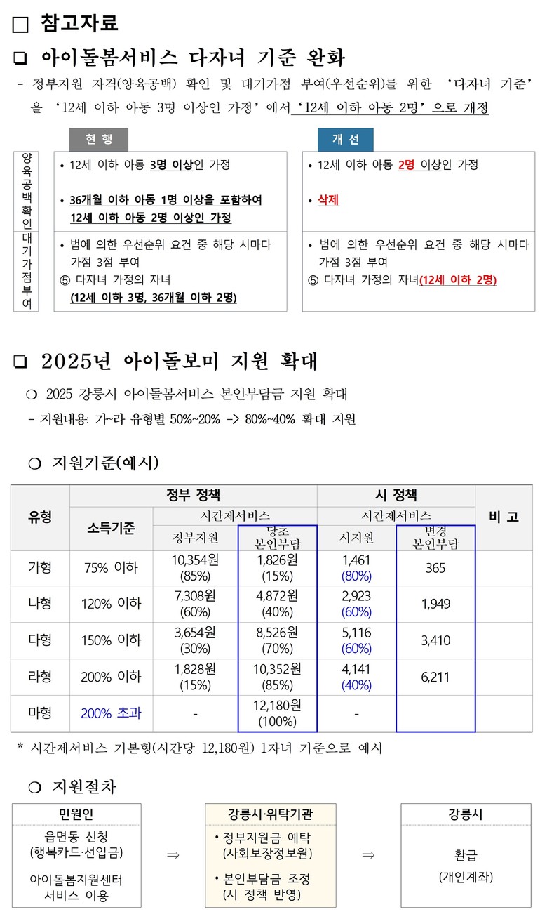 강릉시 아이돌봄서비스 본인 부담금 지원은 아이돌봄서비스 신청 시 같이 신청할 수 있으며, 본인 부담금 선납 후 다음 달 환급해주는 방식이다.