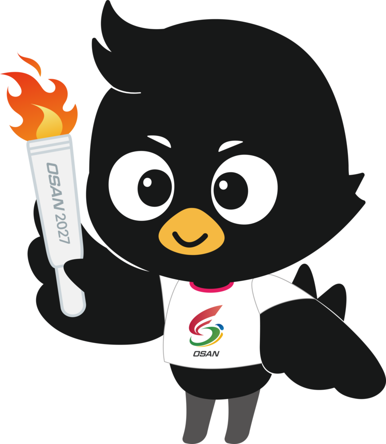 마스코트는 엠블럼을 보완하는 핵심 시각 요소로, 오산시를 대표하는 기존 캐릭터 ‘까산이’를 스포츠 콘셉트로 재해석했다. 친근한 이미지를 유지하면서도 역동적인 동작과 표정을 더해 체육대회의 현장성과 활력을 강조했으며, 비장애인·장애인 종목별 응용형과 시설물·행사용 응용형 등 다양한 활용이 가능하도록 설계됐다.